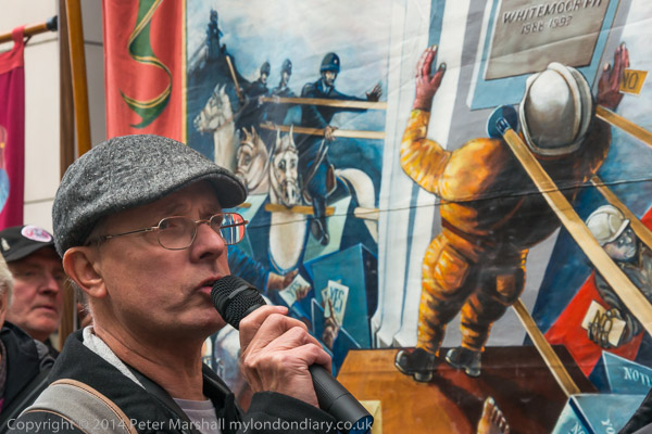 Granville Williams of the Orgreave Truth and Justice Campaign in frort of the last NUM Colliery banner to be produced, the