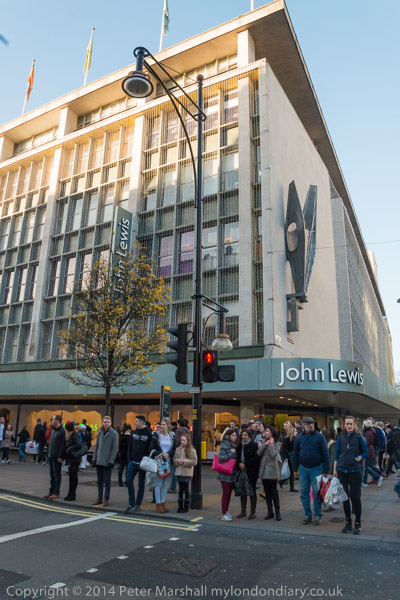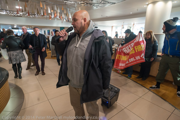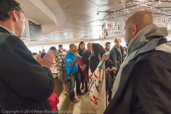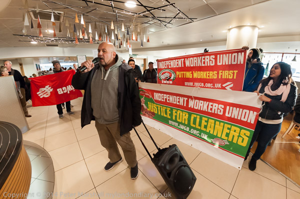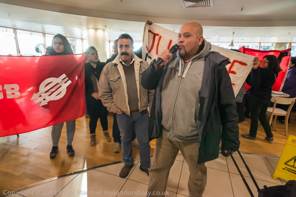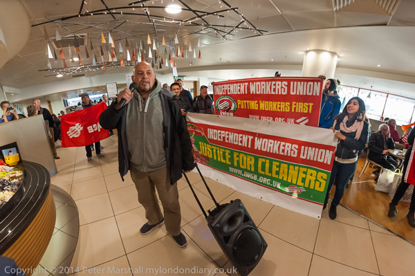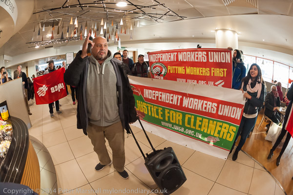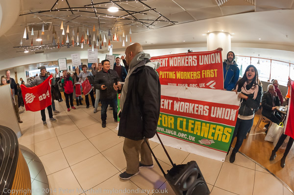 ![]() John Lewis's flagship store on Oxford St as the cleaners were going in to protest for a living wage and equal treatment ![]() It was in the middle of Christmas shopping and a brass quintet were playing inside the store as I made ![]() my way up to the fifth floor ![]() It took me a minute or two to find the cleaners who were in a group getting ready for the protest, getting out the ![]() amplifier and banners at the side of the main counter in the restuarant area ![]() IWGB cleaner's leader Alberto Durango spoke briefly to tell customers and staff why the cleaners were protesting ![]() The cleaners want to be paid a living wage and to be treated like the others who work in the store ![]() John Lewis does not employ the cleaners, but uses a cleaning contractor. The cleaners get low pay, poorer conditions ![]() and are treated as second class citizens in the store. There work is vital but John Lewis refuses to recognise this ![]() Although they are employed by a different company, many of the cleaners have actually worked in the store ![]() for years. The other people who work in the store are directly employed by John Lewis and are 'partners', sharing in the company profits through a bonus |