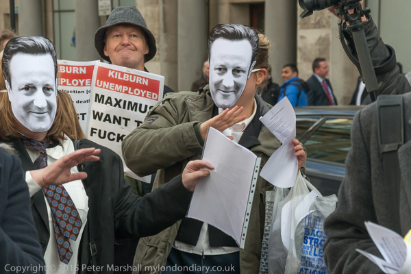 and Kilburn Unemployed Worker’s Group Choir wearing David Cameron masks sing their 'David Cameron is a W******'.