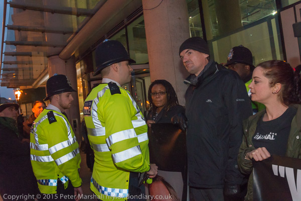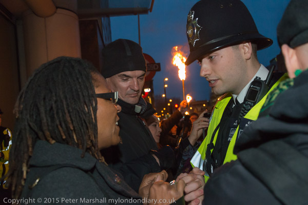 Constable Reihill tells each of those holding the banner that they are committing an offence