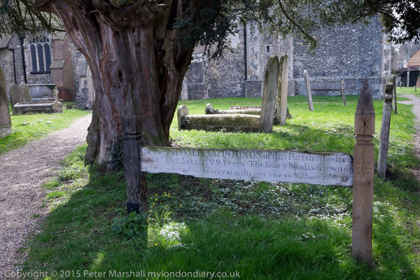 A wooden memorial at the gate to St. Peter & St. Paul's, Farningham to William Pounds of this parish, 99 when he died in 1822