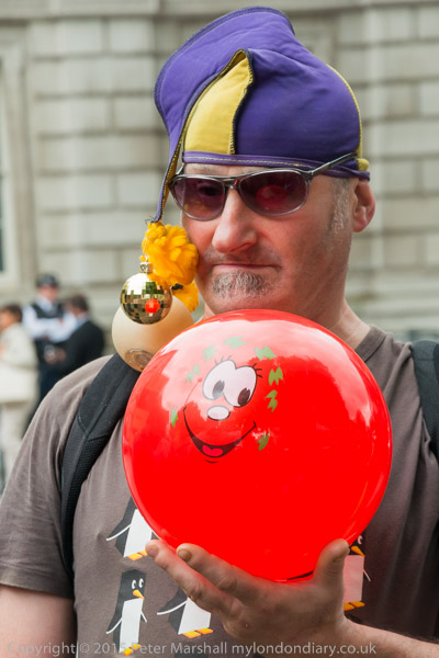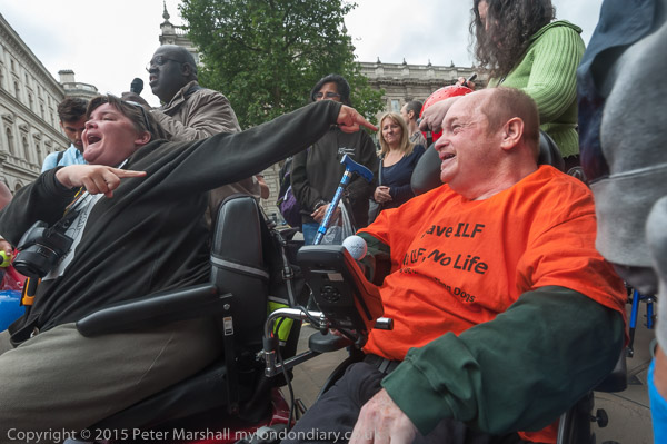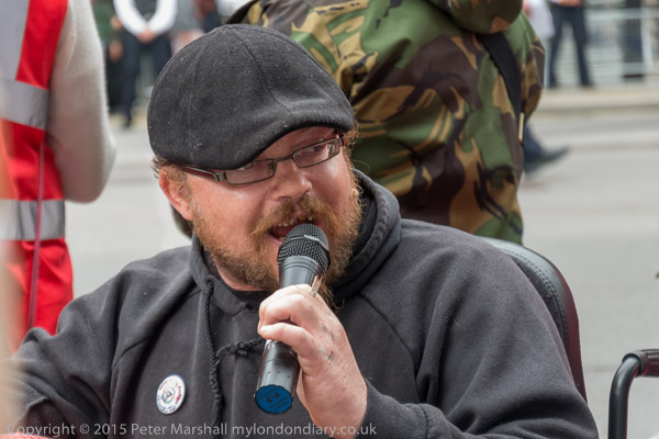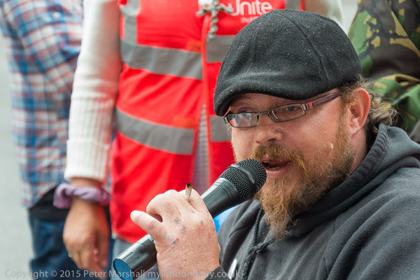 and leads the protesters across the road towards Downing St