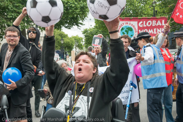 Paula Peters holds up two balls with messages for Osborne and Cameron