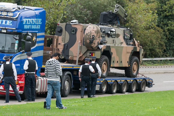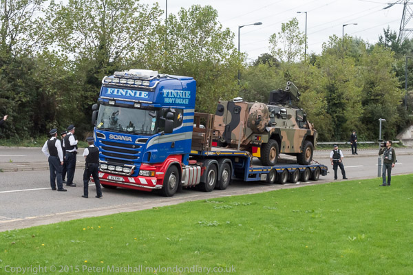 A lorry with a military vehicle on it, perhaps a rocket launcher - approaches