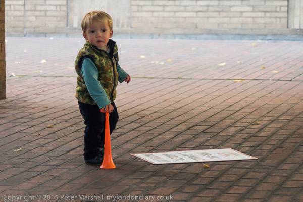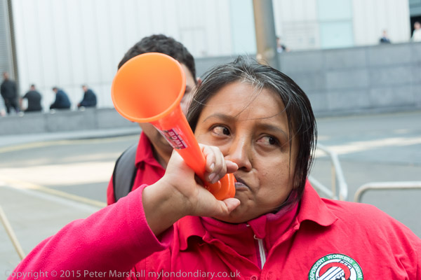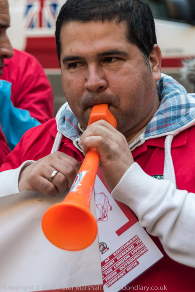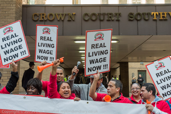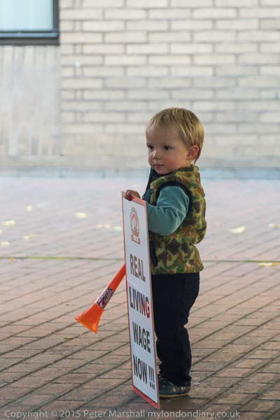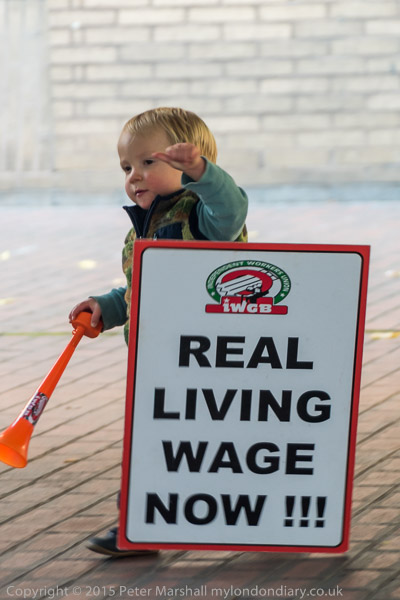 A young protester struggles towards the court with a horn and a poster for a 'Real Living Wage Now!'