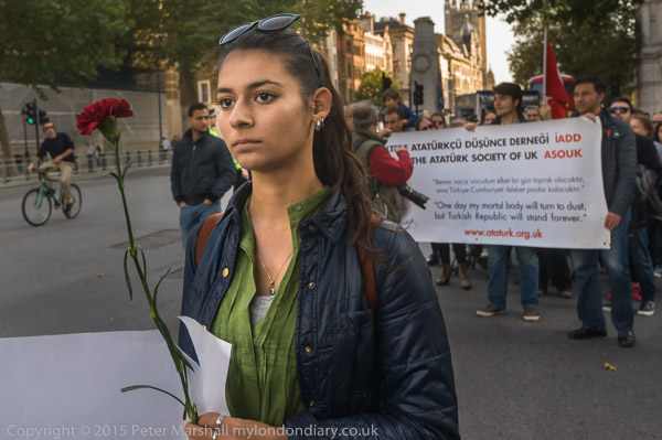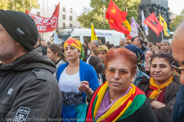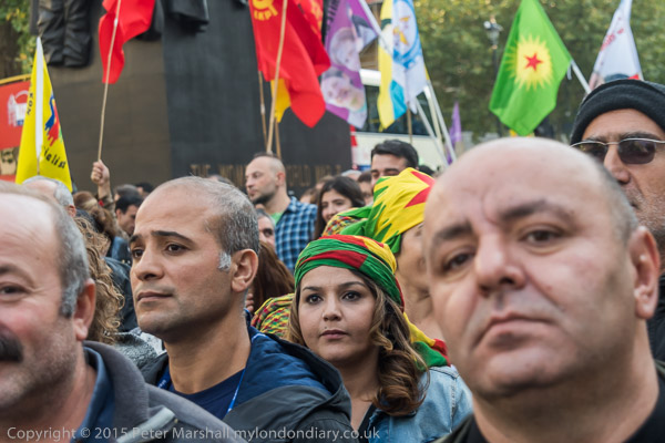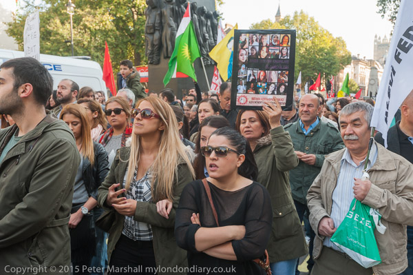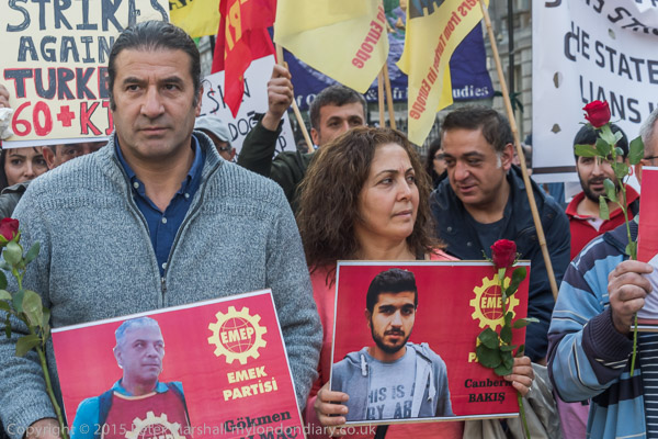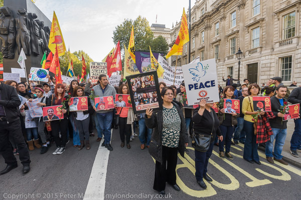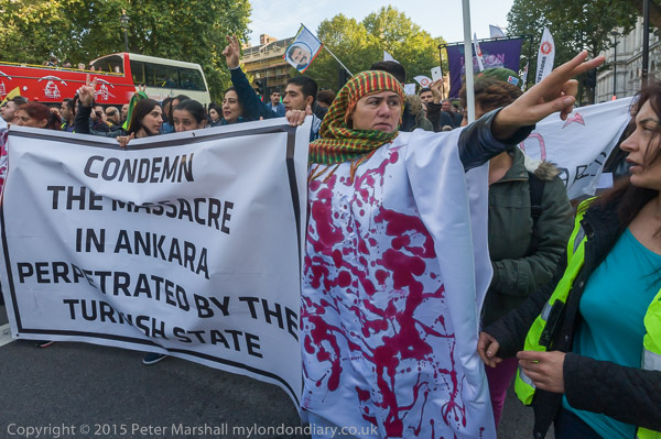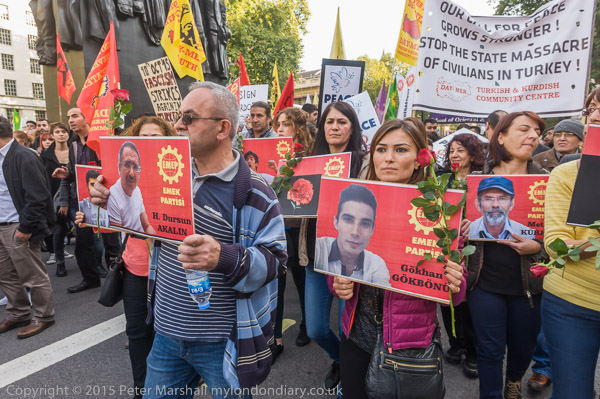 People march up Whitehall behind a Day-mer Banner hodling pictures of some of those killed in Ankara massacare