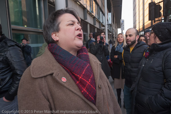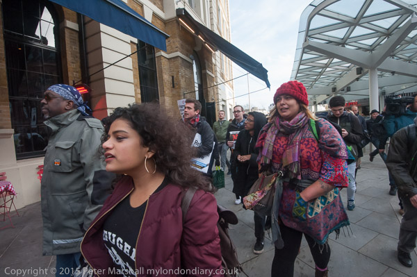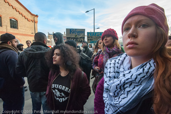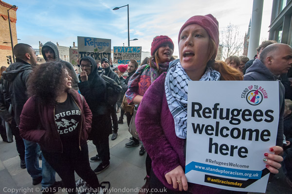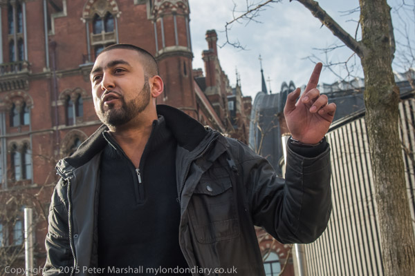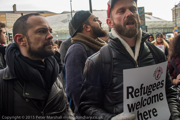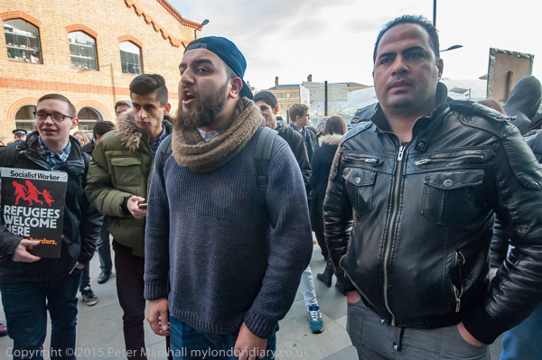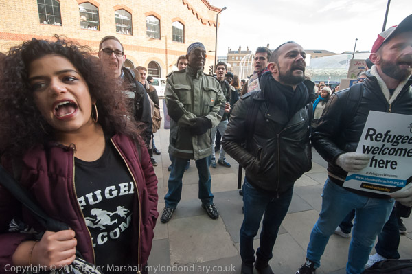 one of the organisers talks briefly about Calais and asks everyone to walk to protest at St Pancras International