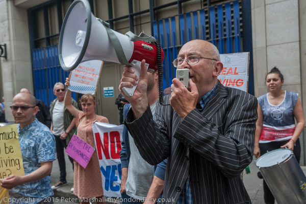 One of the striking cleaners speaks at the protest. 'No to job cuts! Yes to a living wage!'