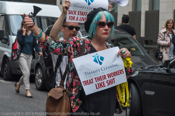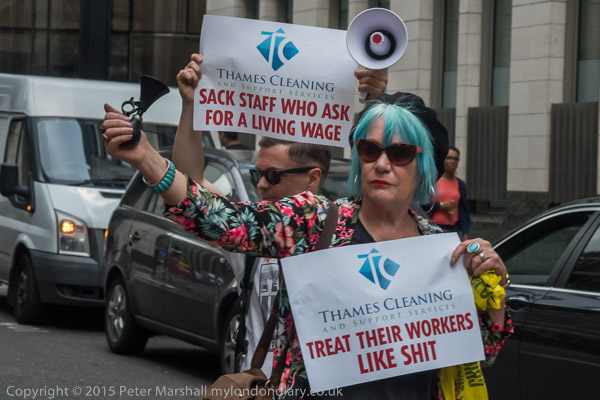 along with the other which says 'Thames Cleaning Sack Staff who ask for a living wage'