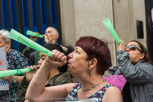 Vera from UVW blows a plastic horn and Jane Nicholl of Class War beeps her horn