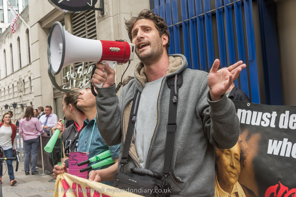 Victor Ramirez brings across posters from the picket at the entrance to 100 Wood St to the protest