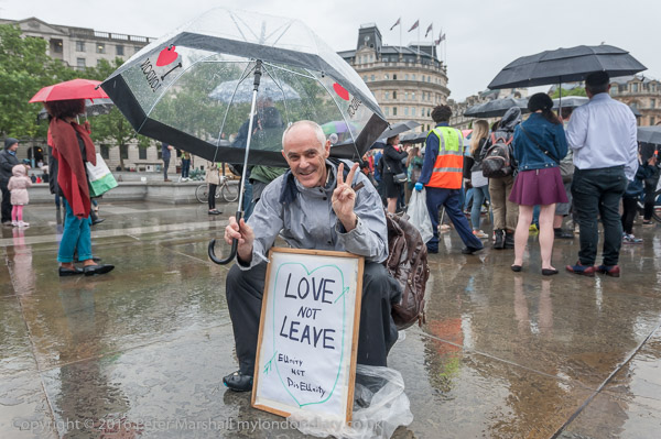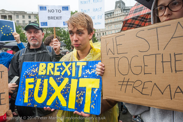 People gather in the rain for a protest after the Brexit vote. Everyone feels cheated as politicians deny the promises