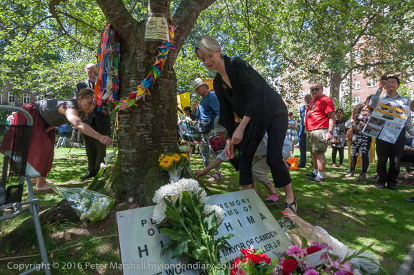 Cllr Nadia Shah, Mayor of Camden, lays a wreath at the commemorative cherry tree