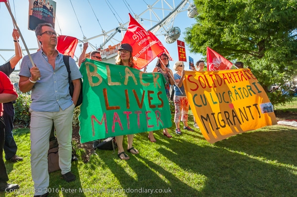 There are banners 'Black Lives Matter' and for solidarity with migrants akibg with the Unite flags