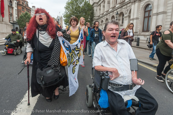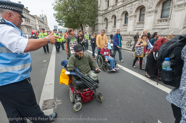 The protesters stop on the road in front of Downing St. Police direct traffic around them