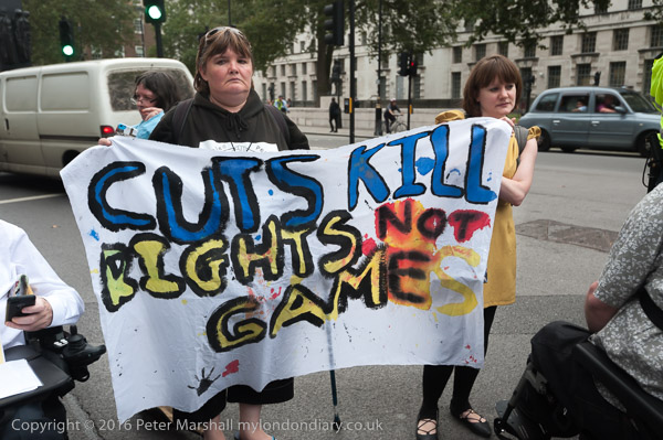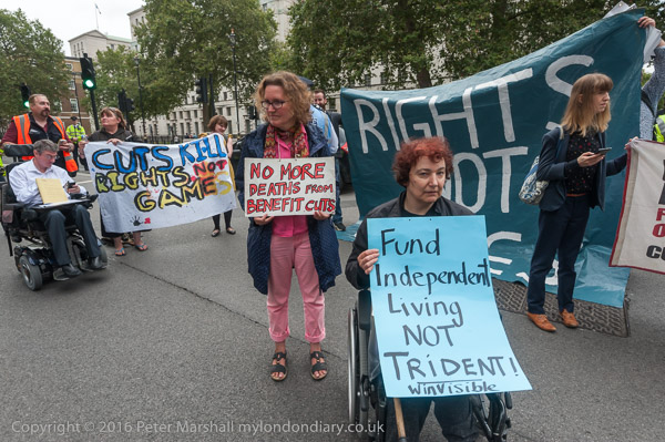'Claire Glasman holds a poster 'Fund Independent Livinv NOT Traiden!'