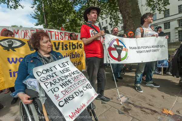 'Don't Let Govt. use Paralympics to Hide Deaths & Destitution Caused by Cuts' reads a Winvisible poster