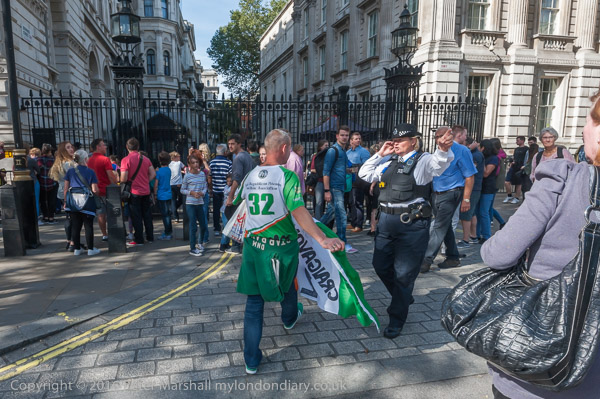 ![]() and a man in a green top and shoes takes it over to be photographed in front ![]() of the gates of Downing St. A police officer tells him that he can't protest there ![]() and ![]() after standing for a few photographs he walked back across the road ![]() |