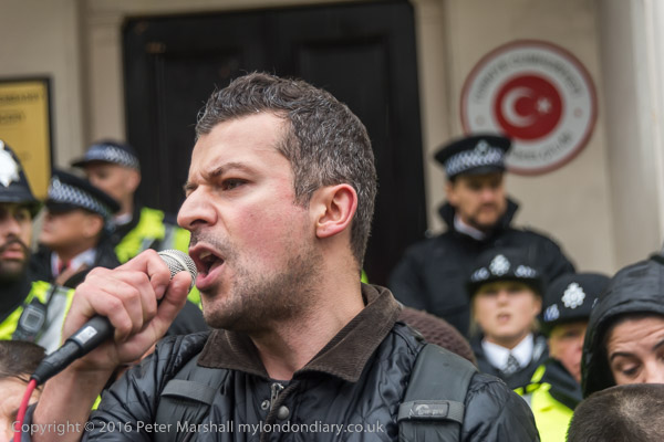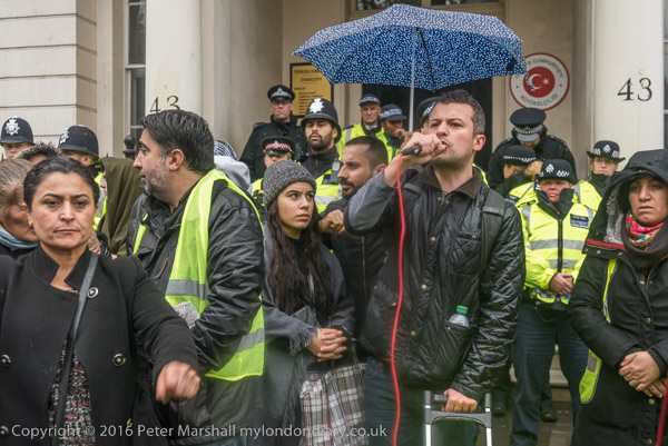 People listen to speeches in front of the Turkish embassy in the rain