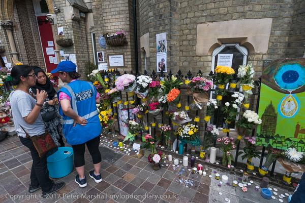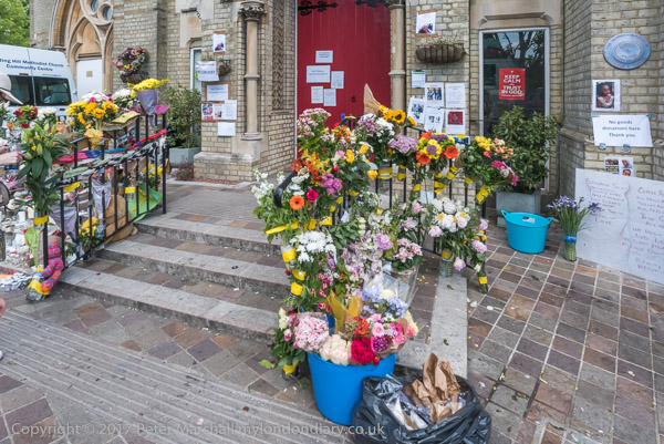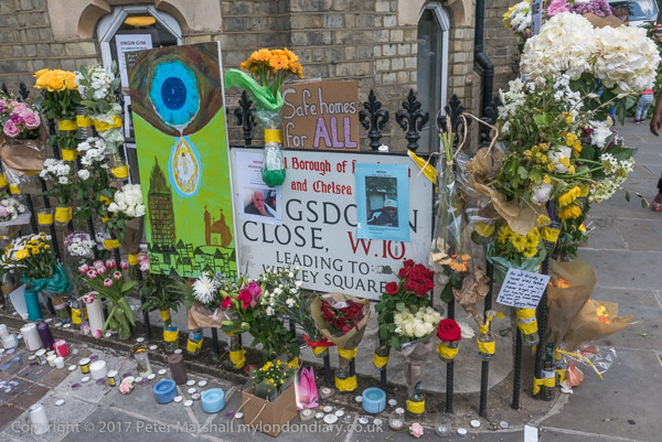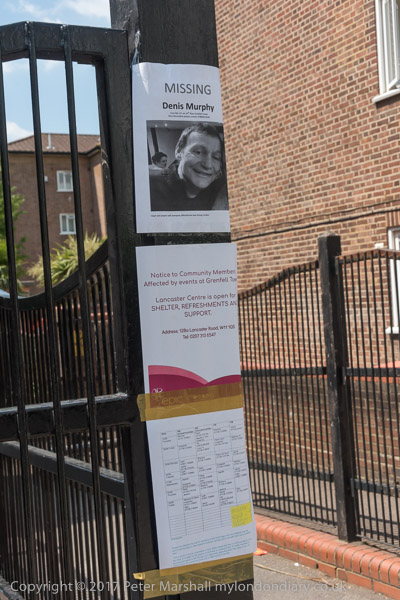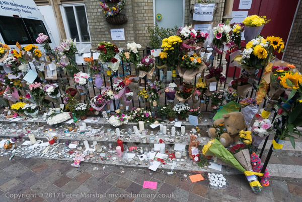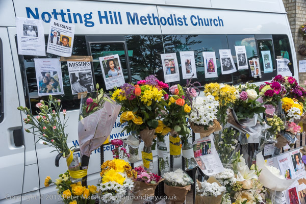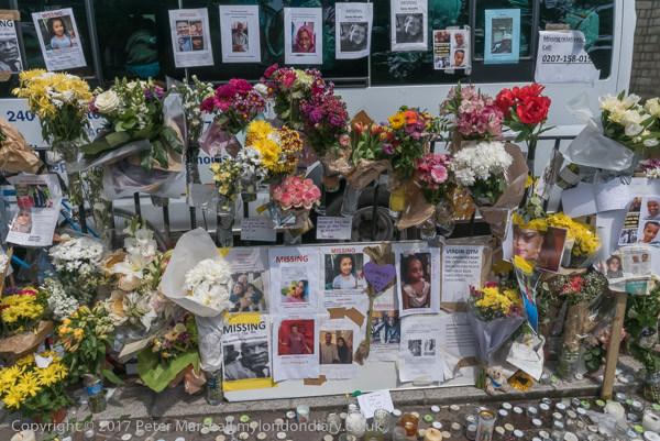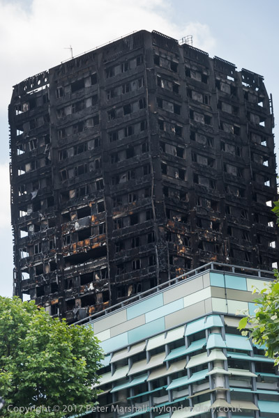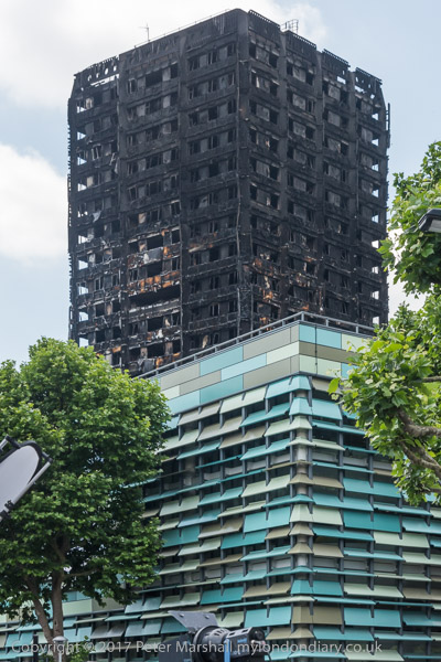 Grenfell Tower from the church. Police barriers prevent a closer approach