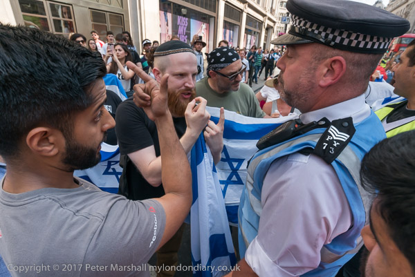 A protester from the Al Quds day march comes to tell the police they