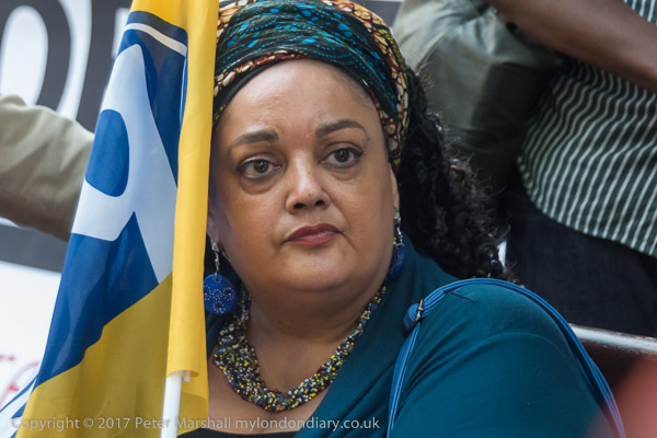 Zita Holbourne holds a Pcs flag as she waits to speak
