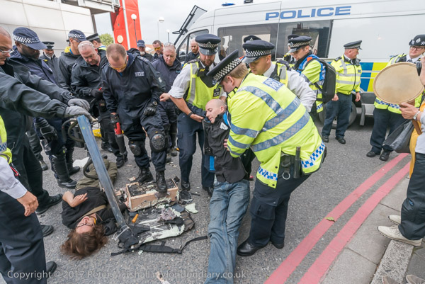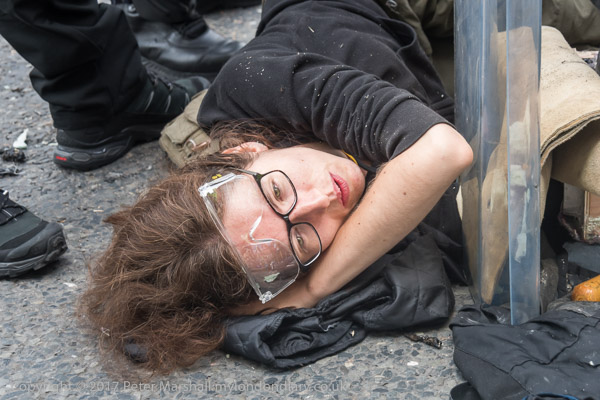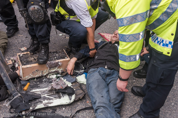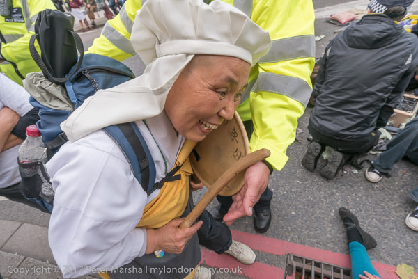 One of the Buddhists arrives and is moved onto the pavement by a police