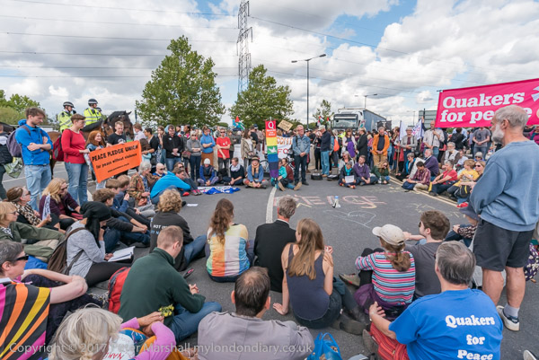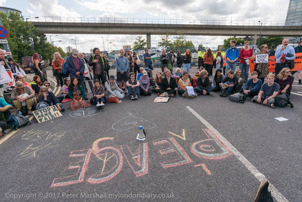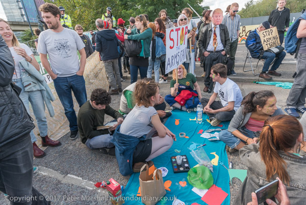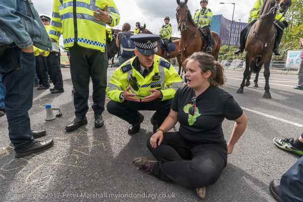 and protesters sitting on the blocked road