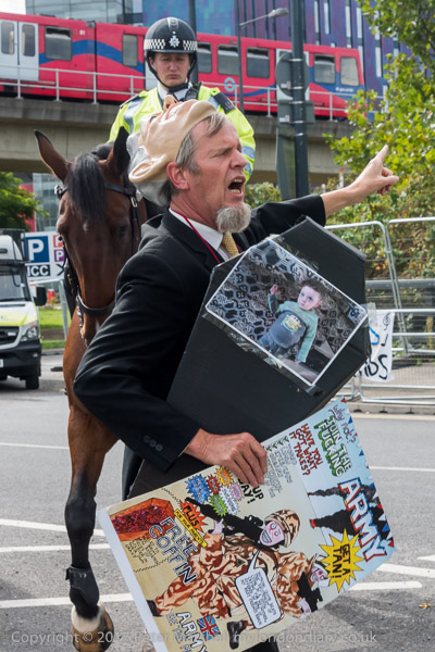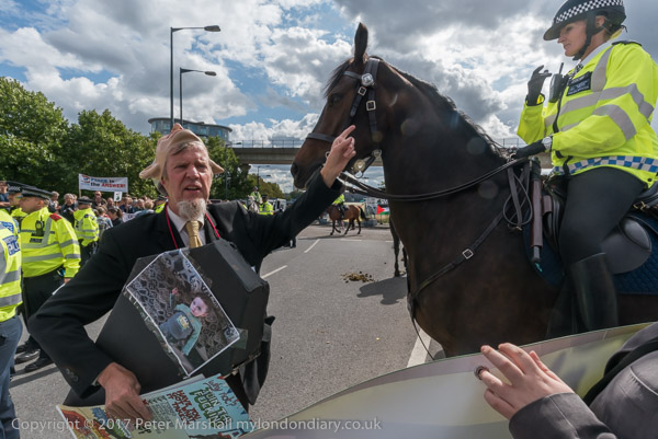 A protester shouts to a police officer on a horse, asking her how