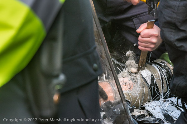 A police officer hammers a chisle into the concrete around an arm