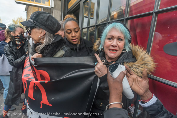 A security guard pushes Jane Nicholl to make here move away from the