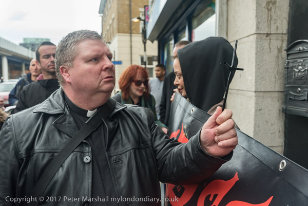 Two men going into the exhibit shout insults at Father Brannigan