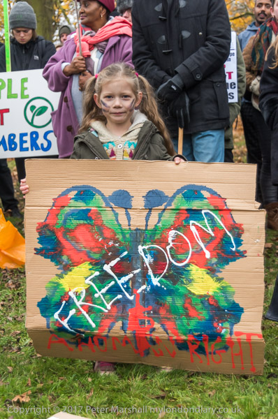 A young protester with a poster showing a butterfly and the message