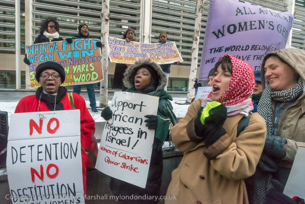 Protesters at the home office supported the hunger strike and refusal to work by the 120 women and men in immigration detention at Yarl's Wood.
