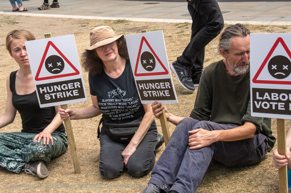 A hunger striker holds two red umbrellas - one saying the SNP have