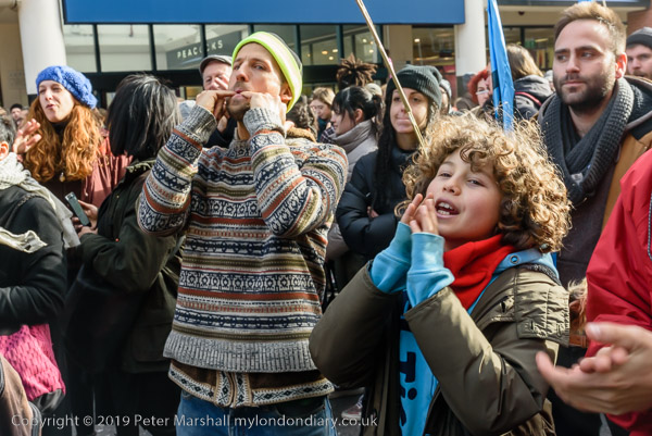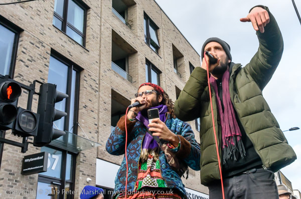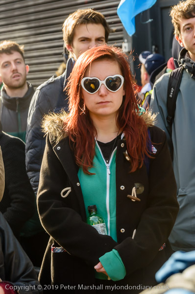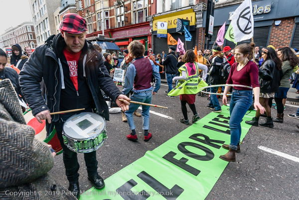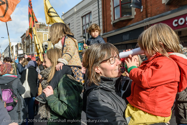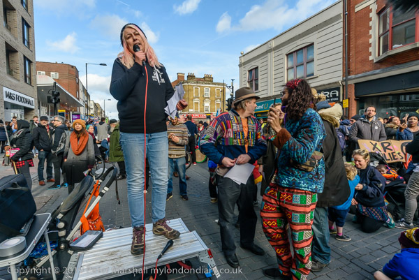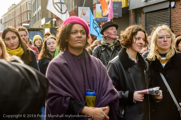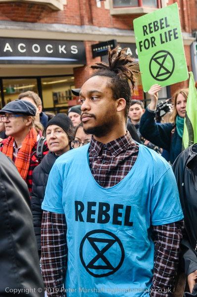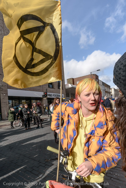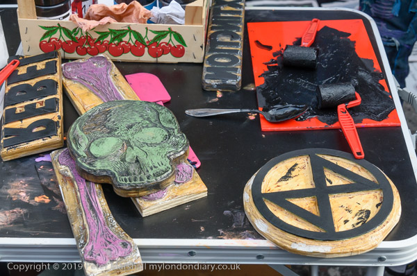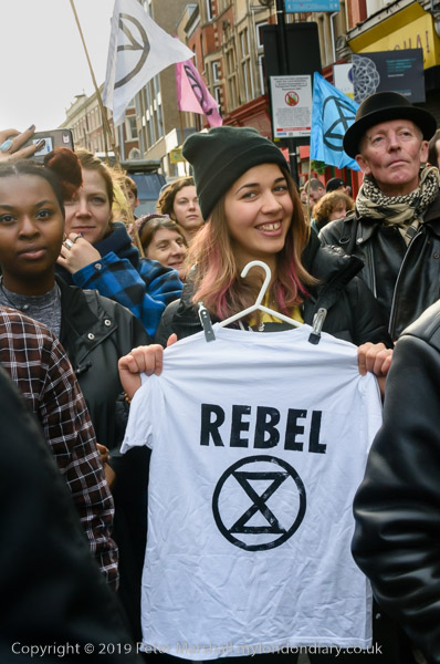 A woman holds a t-shirt printed at the Extinction Rebellion street