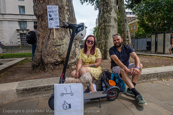 Users of Personal Light Electric Vehicles (PLEVs) protest at Downing St for electric scooters and similar low-powered personal transport devices to be legalised on a similar basis to electric bicycles.