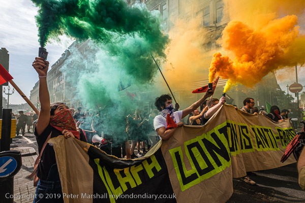 The London Anti-Fascist Assembly and other groups opposing the extreme right met at Oxford Circus and marched up Regent St towards the BBC where a small group of Robinson supporters had gathered. Police marched with the anti-fascists and a line of officers stopped them a few yards from the Free Tommy protest as they attempted to approach, and after some shouting at the protesters they were pushed by police to a pen on the opposite side of the road.