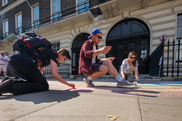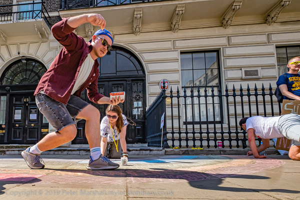 People are making a giant chalk rainbow on the pavement in front of