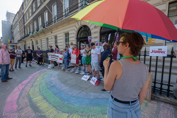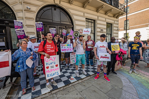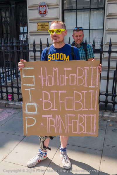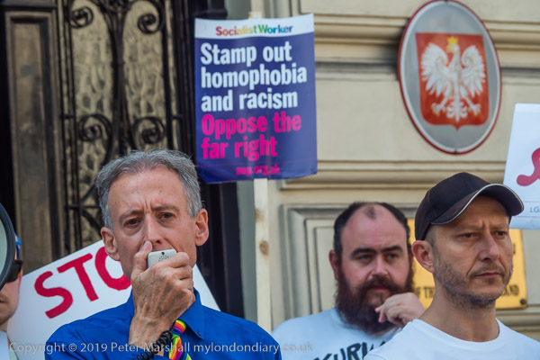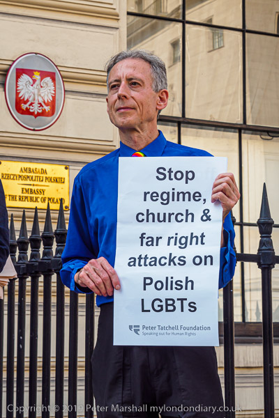 And another man holds a poster for the Peter Tatchell Foundation