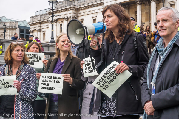 Alexandra Geese holds a poster 'Defending The Right To Protest'