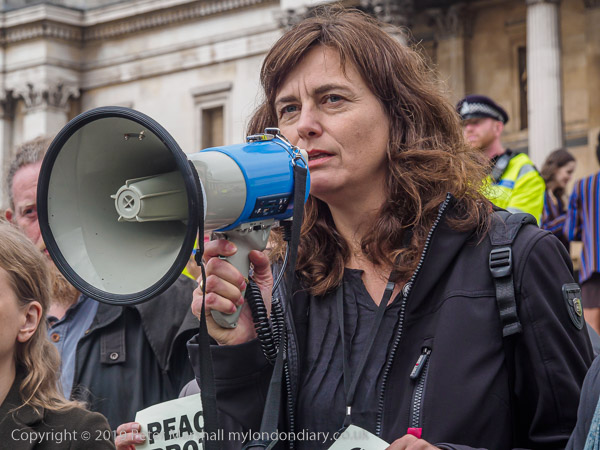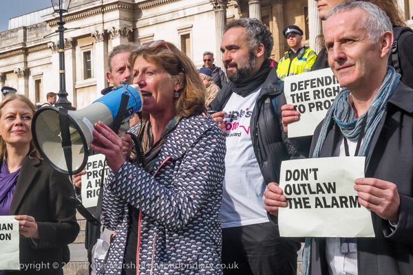 Angela Zelter with a poster 'Freedom of Speech and Association Are