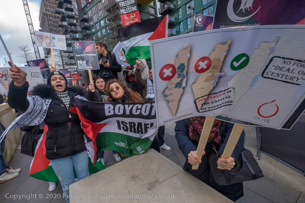 People including many Palestinians, protest at the US Embassy against Trump's 'Deal of the Century'.