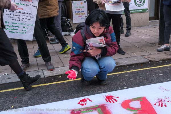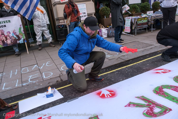 A man starts painting the slogan 'GLENCORE BLOOD ON YOUR HANDS' on