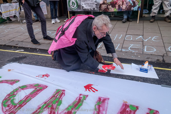 and people are invited to put on gloves to make bloody hand hand prints