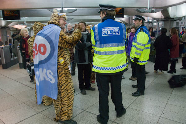 ![]() E$$o tigers meet the police at Westminster station as they arrive for the march |