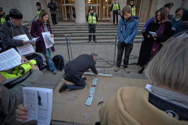 ashes and theses nailed to a cross outside the Defence MinistryPax Christi, Catholic Peace Action and Christian CND have held an annual liturgy of Repentance and Resistance around the Ministry of Defence in protest against the continued reliance on nuclear weapons every Ash Wednesday since 1982, making this event the 26th.