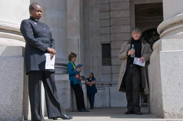 Just Share are based at St Mary-le-Bow church in Cheapside, and the event took place just down the road in the heart of London's square mile, in front of the Royal Exchange, flanked by the Bank of England. We were treated to some very listenable jazz and an opportunity to find out more about the work of various groups including Operation Noah (a Christian-based charity campaigning about the environment) and Muslim Aid, before speeches by Ann Pettifor (Advocacy International and Operation Noah, previously Jubilee 2000) and Larry Elliott (The Guardian.)