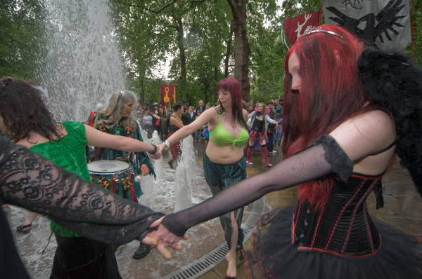 The fountain in Russell Square could have been designed with them in mind, with a strongly phallic character in the water jets, which in normal use rise and fall, but were left to flow at full strength for most of the ceremony. At first the group danced around the fountain in rings with hands joined, but then many of them started to run through the centre, many getting soaked. Even the drummers, who at first stood on the edge providing a rhythm for the dance, eventually ran though the jets, and finally the Green Man also did so.