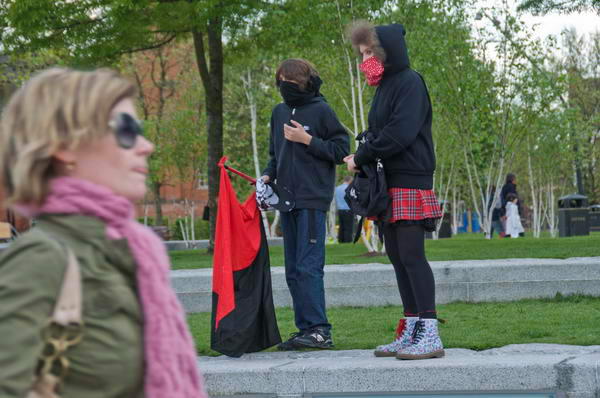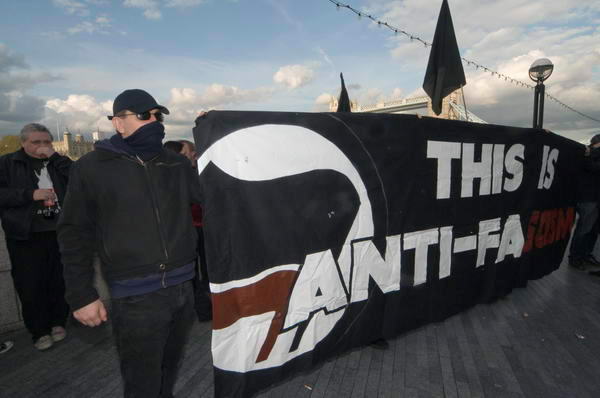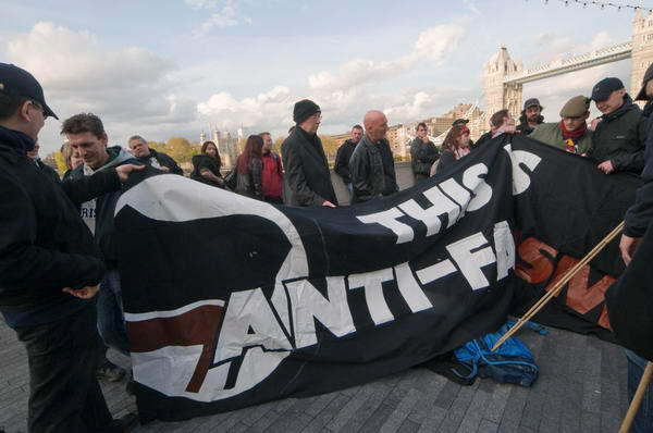 ![]() The first anarchist banner was held up outside City Hall at 18.19 by two young anarchists, stating 'THIS IS OUR LONDON'. |